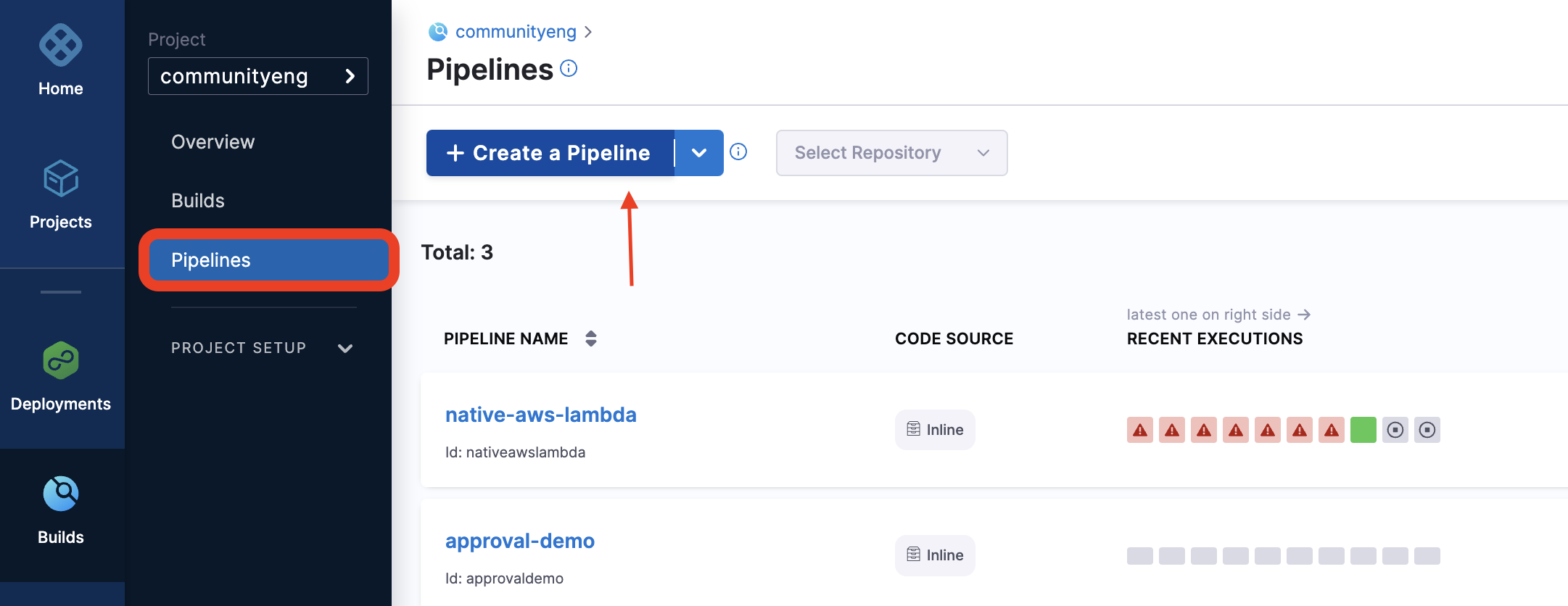 Select Pipelines, and then select Create a Pipeline.