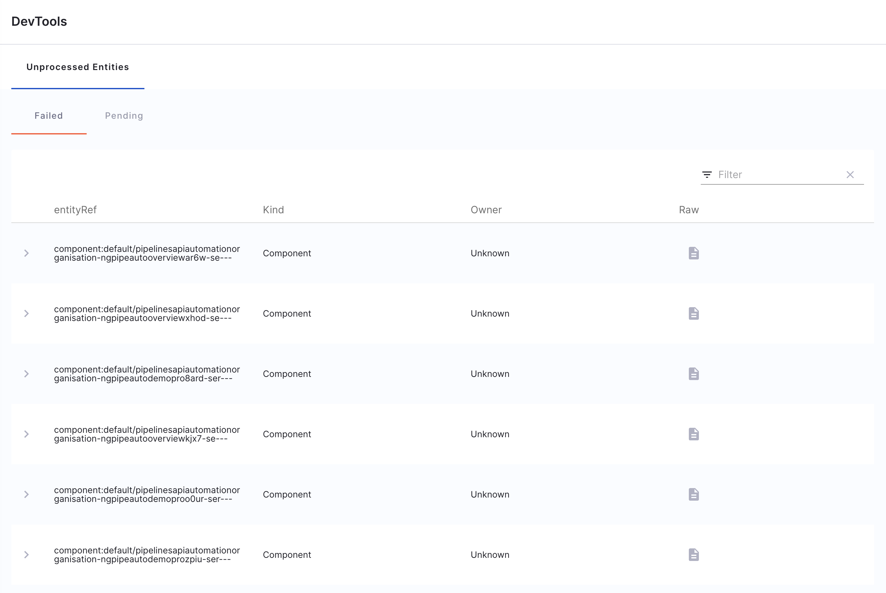 • The Entities tab offers a searchable, filterable, and sortable table of all Components, APIs, and Resources within the System.